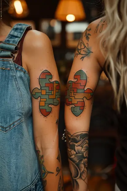 These tattoos showcase colorful puzzle pieces on the upper arms of two sisters. Each tattoo is a piece of a larger puzzle, symbolizing how the sisters fit together perfectly. The use of bold colors and clean lines gives the tattoos a playful and dynamic look.