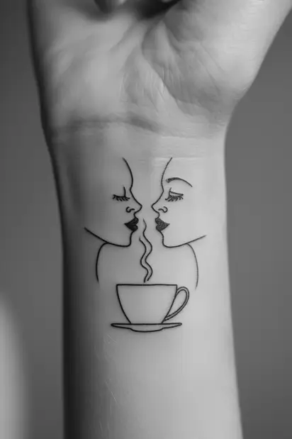 This tattoo features two sisters profiles facing each other with a steaming cup of coffee between them, placed on the wrist. The minimalist black ink design is simple yet expressive, capturing a shared moment over coffee.