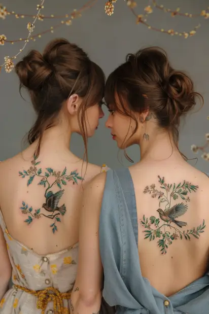These tattoos feature detailed birds perched on branches on the backs of two sisters. The black ink designs are delicate and intricate, with the birds and branches complementing each other when the sisters stand together. The tattoos are placed on the upper back, creating a harmonious look.