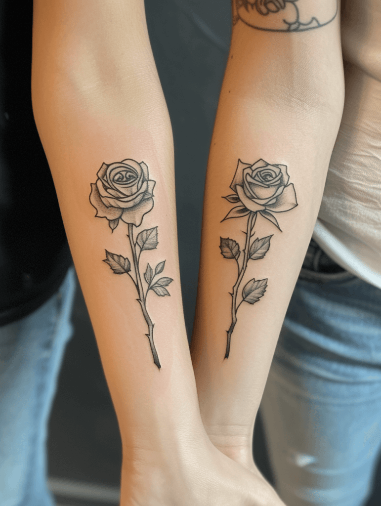 These tattoos display matching rose designs on the forearms of two sisters. The black ink roses are detailed and elegant, representing love and beauty. When the sisters place their arms together, the roses align, creating a cohesive and lovely look.