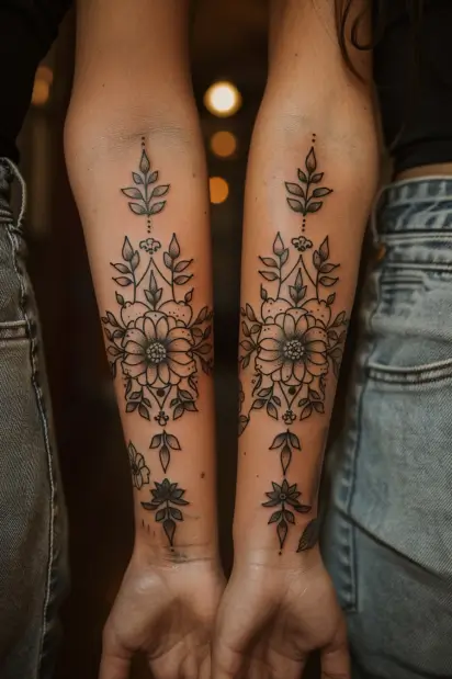 These tattoos feature intricate mandala floral designs, each placed on the forearms of two sisters. The detailed patterns intertwine beautifully, creating a sense of unity and symmetry when their arms are together. The use of black ink highlights the fine lines and delicate nature of the flowers and leaves.