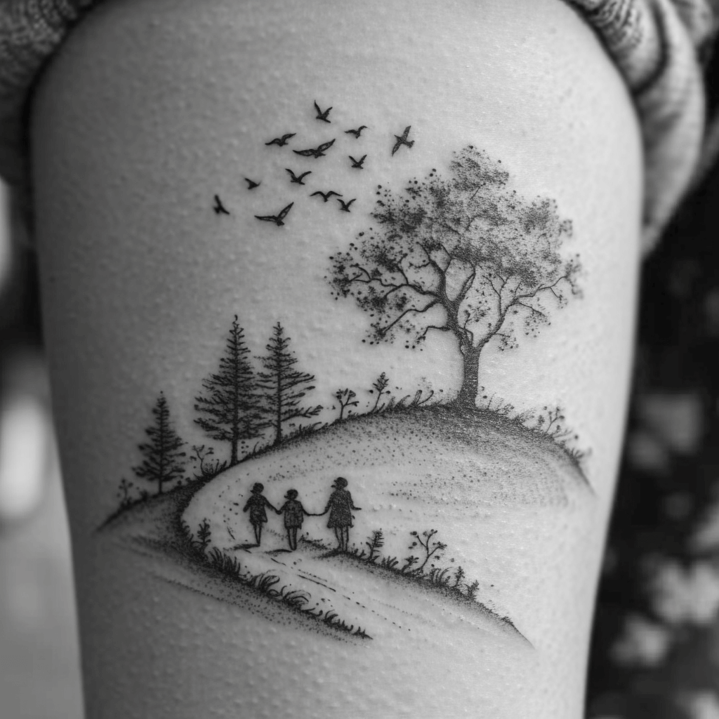 This tattoo features two sisters walking hand in hand up a hill, surrounded by trees and birds, placed on the thigh. The black ink design is simple yet detailed, capturing the peacefulness of a shared walk in nature.