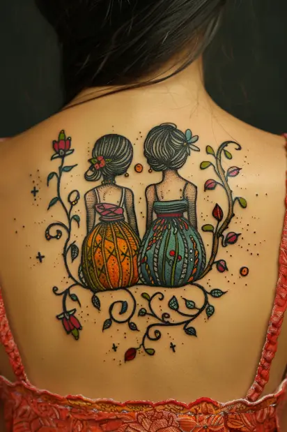 This tattoo depicts two sisters sitting in a garden, placed on the upper back. The colorful dresses and intricate floral patterns create a vibrant and playful scene. The use of bright colors and fine details makes the design stand out.