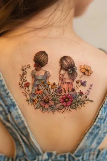 This tattoo features two young girls standing in a field of flowers, placed on the upper back. The colorful design includes various flowers and butterflies, creating a vibrant and nostalgic scene. The girls are dressed in simple, timeless clothing, evoking childhood memories.