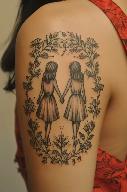 This tattoo shows two sisters holding hands, framed by an intricate floral wreath, placed on the shoulder. The black ink design is detailed and elegant, with fine lines and shading creating a classic look. The floral wreath adds a touch of nature and beauty to the piece.
