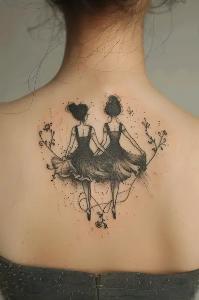 This tattoo features two sisters dancing, placed on the upper back. The black ink design captures the joy and movement of the dance, with flowing dresses and intertwined vines adding to the beauty of the piece.