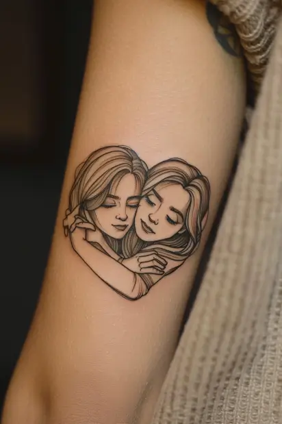 This tattoo shows two sisters embracing, placed on the inner arm. The design is detailed and captures the warmth and love between the sisters. The use of fine lines and shading adds depth and realism to the piece.