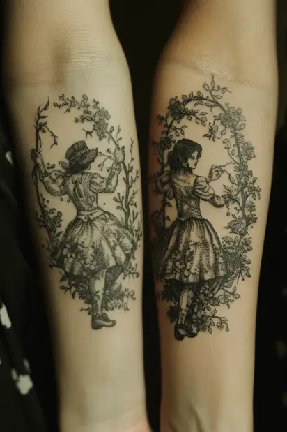 These matching tattoos depict two vintage-styled sisters in dresses, each framed by a floral arch, placed on the forearms. The detailed black ink work captures a classic, old-world charm, with intricate patterns and textures.
