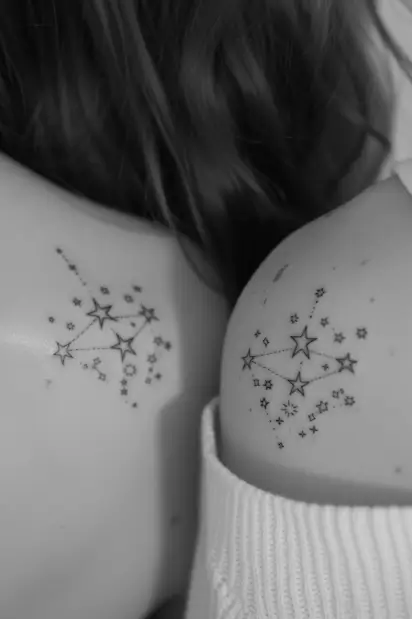 These tattoos feature constellation designs on the shoulders of two sisters. The black ink stars and dots form delicate constellations, symbolizing their unique connection in the universe. The designs are simple yet meaningful, perfect for a subtle tribute.