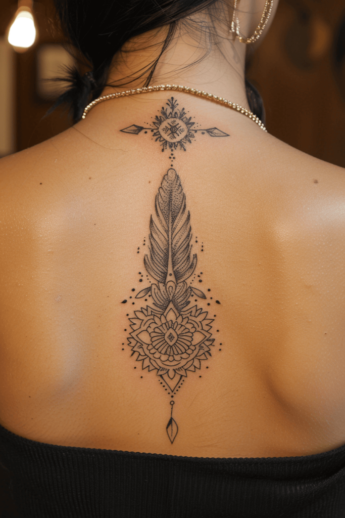 This spine tattoo combines a feather with floral elements in a black and grey style. The design starts at the nape of the neck and flows down the spine, creating a graceful and feminine look. The blend of feathers and flowers symbolizes freedom and natural beauty. I think this tattoo is beautiful because it elegantly follows the spine s curve, making it a unique and personal piece of art.