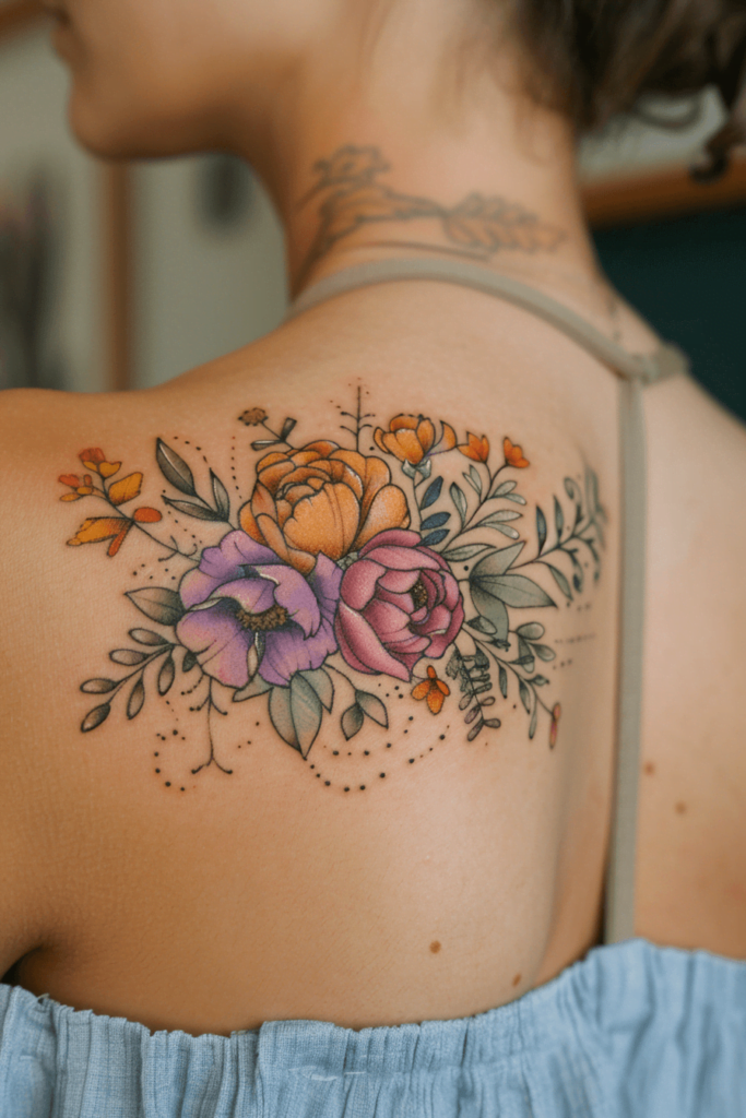 This colorful tattoo on the back showcases a bouquet of flowers in a watercolor style. The vibrant hues and fluid lines give it a lively and artistic look. Each flower is meticulously detailed, adding depth and dimension to the design. I love this tattoo because it looks like a painting on the skin, blending colors seamlessly and creating a stunning visual effect.