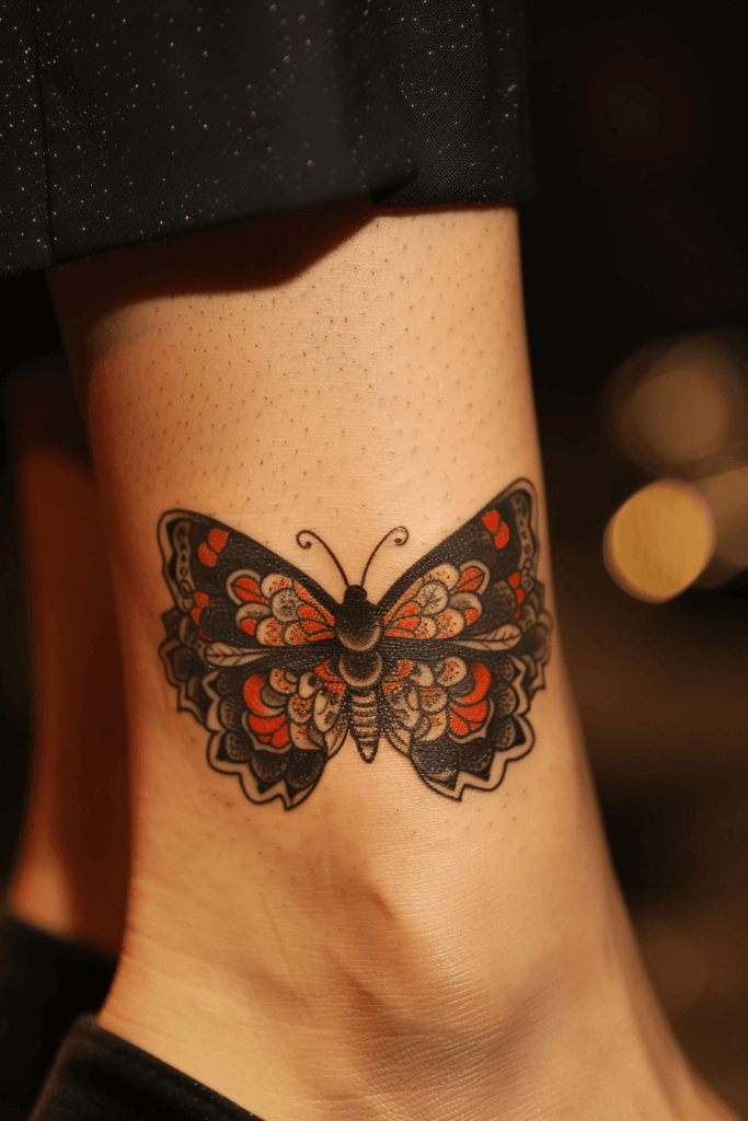 This butterfly tattoo on the ankle features vibrant colors and intricate patterns. The butterfly s wings are detailed with various shapes and hues, making it stand out. This design symbolizes transformation and beauty. I love this tattoo because of its small size and detailed artwork, making it a perfect choice for a subtle yet eye-catching piece.