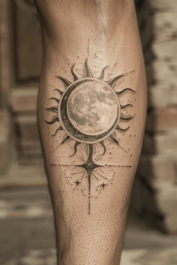 This tattoo on the calf features a sun and moon design with intricate dot work. The sun s rays and the moon s craters are finely detailed, creating a balanced and harmonious image. This tattoo represents the duality of nature and the balance between day and night. I find this design cool because it combines celestial elements in a visually appealing way, making it both meaningful and artistic.