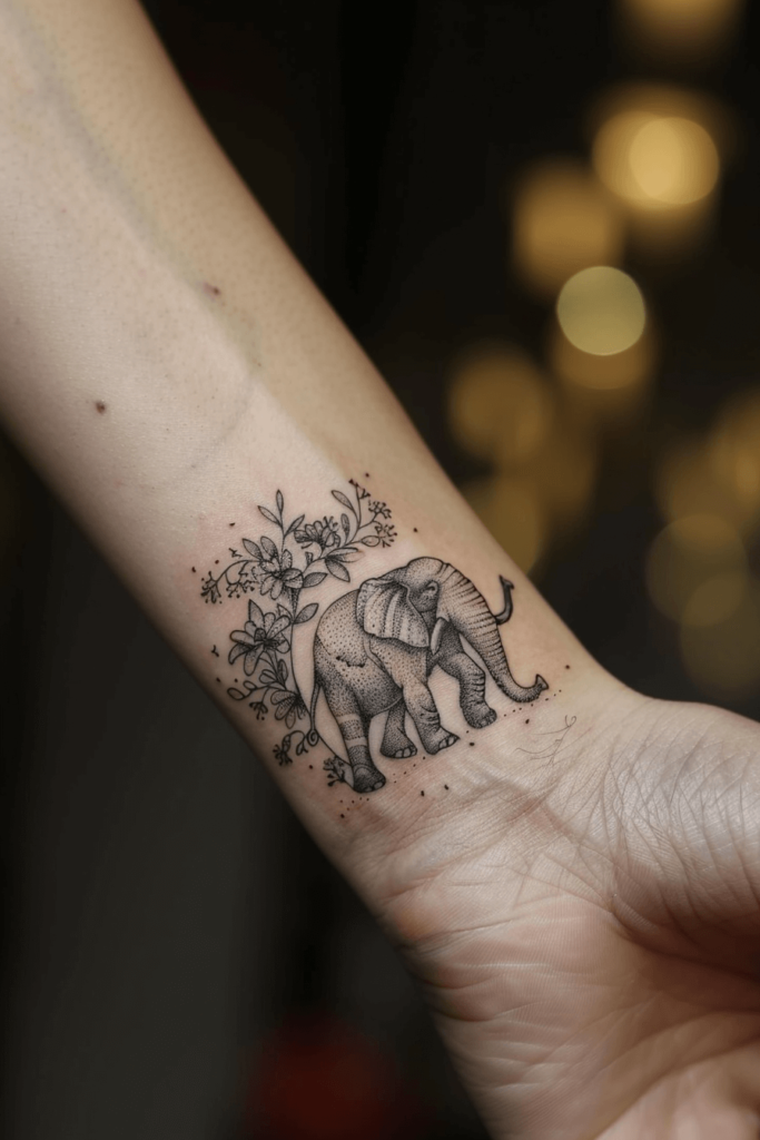 This delicate elephant tattoo on the forearm combines fine lines and floral details. The elephant is depicted in a realistic style, surrounded by small flowers. This design symbolizes strength and wisdom. I think this tattoo is nice because it merges realism with delicate floral elements, creating a balanced and meaningful piece.