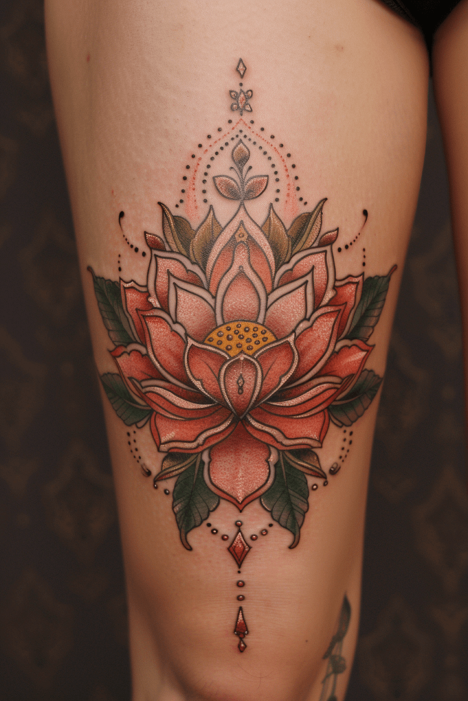 This lotus tattoo on the thigh is done in a neo traditional style with bold colors and intricate details. The lotus flower is depicted in full bloom, surrounded by ornamental patterns. This design symbolizes purity and enlightenment. I think this tattoo is impressive because of its vibrant colors and detailed artwork, making it a stunning and meaningful piece.