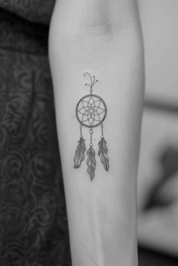 This dreamcatcher tattoo features delicate lines and a minimalist design on the forearm. It includes a small hoop with intricate webbing and three feathers hanging below. The simplicity of this tattoo makes it elegant and timeless. I love how it captures the essence of bohemian spirit without being too overwhelming. The fine details add a touch of sophistication, making it perfect for those who prefer subtle body art.