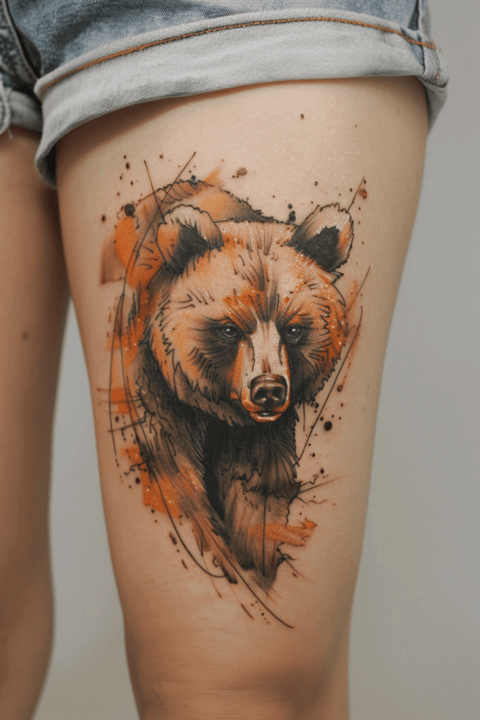This watercolor bear thigh tattoo blends realistic detailing with vibrant, artistic splashes of color. The bear s face is depicted with lifelike precision, while the surrounding watercolor strokes in orange and black add a dynamic, painterly effect. The bold use of color contrasts beautifully with the realistic elements, making the design pop.
