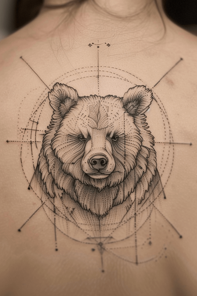 This geometric bear back tattoo combines realism with abstract elements. The bear s face is detailed with fine lines and shading, giving it a lifelike appearance. Surrounding the bear are geometric shapes and patterns that add an artistic and modern touch to the design. The use of black ink highlights the intricate details and clean lines.