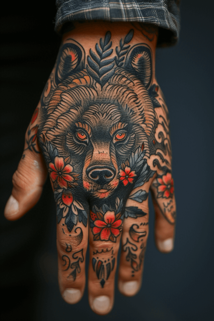 This traditional bear hand tattoo combines bold lines and vibrant colors. The bear s face is depicted in a traditional style, surrounded by floral and leaf patterns that add a touch of nature. The orange eyes and red flowers create a striking contrast against the dark shading of the bear, making the design stand out.