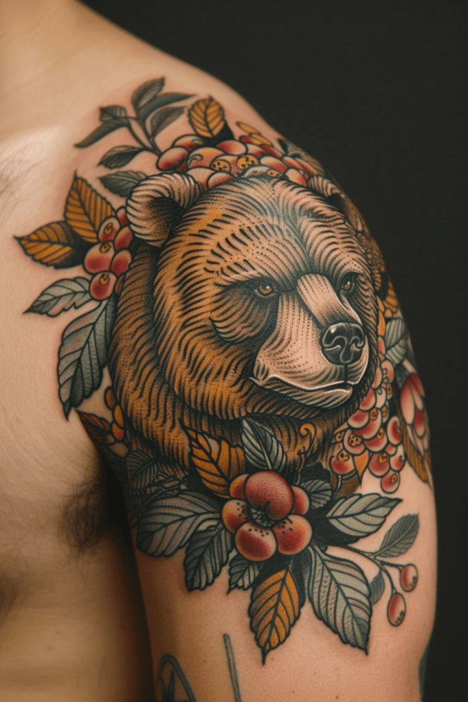 I think this tattoo is impressive because of its vivid colors and dynamic design. The blend of traditional bear imagery with new school elements creates a striking contrast that catches the eye. It s perfect for someone who wants a bold and modern tattoo that still retains a classic subject. This tattoo is both colorful and artistic, making it a standout piece on the shoulder.