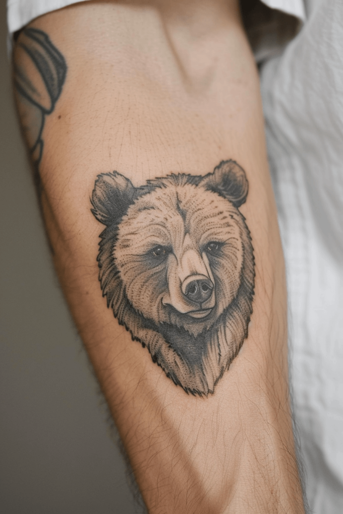 This realistic bear forearm tattoo captures the essence of a bear s face with remarkable detail. The artist has used fine lines and shading to create a lifelike texture of fur and depth in the bear s eyes. The bear s expression is calm and wise, giving the tattoo a serene yet powerful presence.