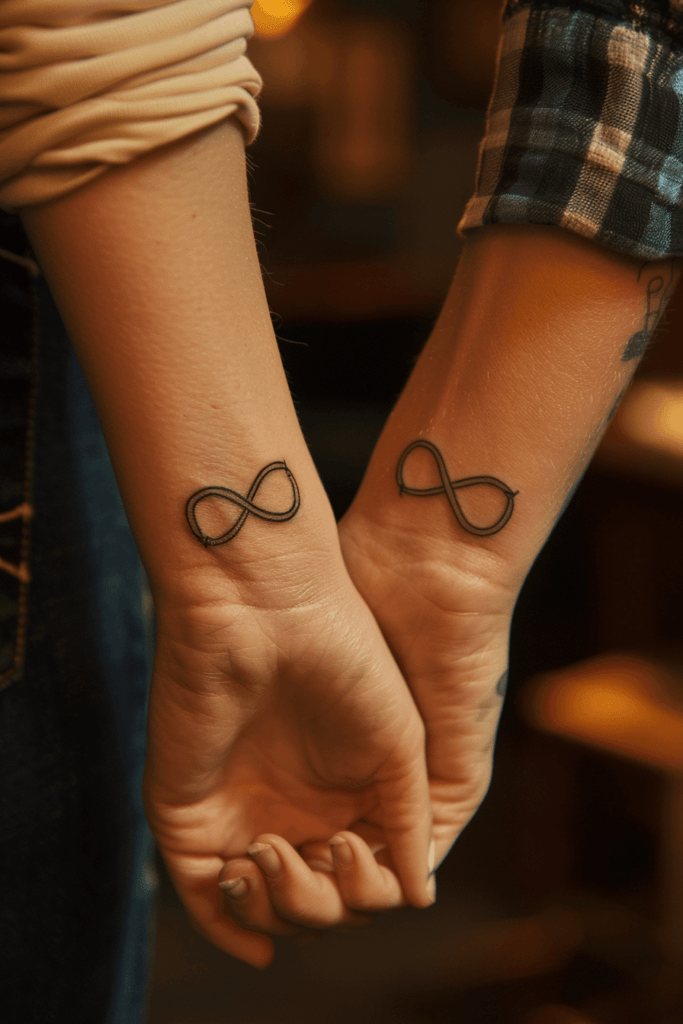 These matching tattoos show a simple infinity symbol on each sibling s wrist. The design is clean and minimalistic, symbolizing endless love and connection. I think this is a cool tattoo because it s subtle yet meaningful, reminding you of your eternal bond every day.