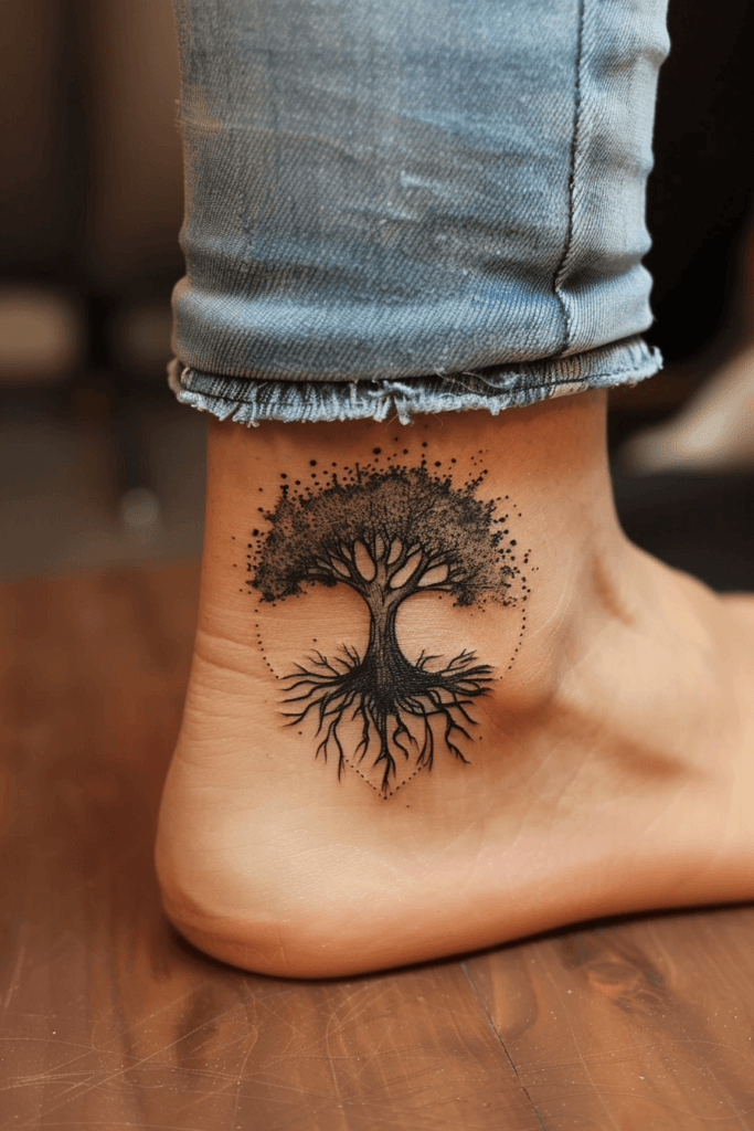 This tattoo on the ankle shows a detailed tree with roots and branches forming a circle. The dot work around the tree adds depth. I find this tattoo cool because it represents growth and the deep roots of family, making it a meaningful choice for siblings.