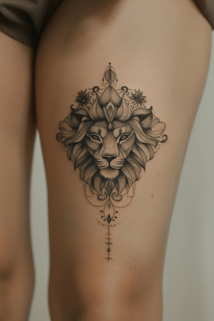 This thigh tattoo showcases an ornate lion s head with intricate patterns and dot work. The design is bold and detailed. If your zodiac sign is Leo, this tattoo is a perfect choice to represent your courage and leadership. I encourage siblings to get their zodiac signs as matching tattoos, reflecting their unique personalities and the bond they share.