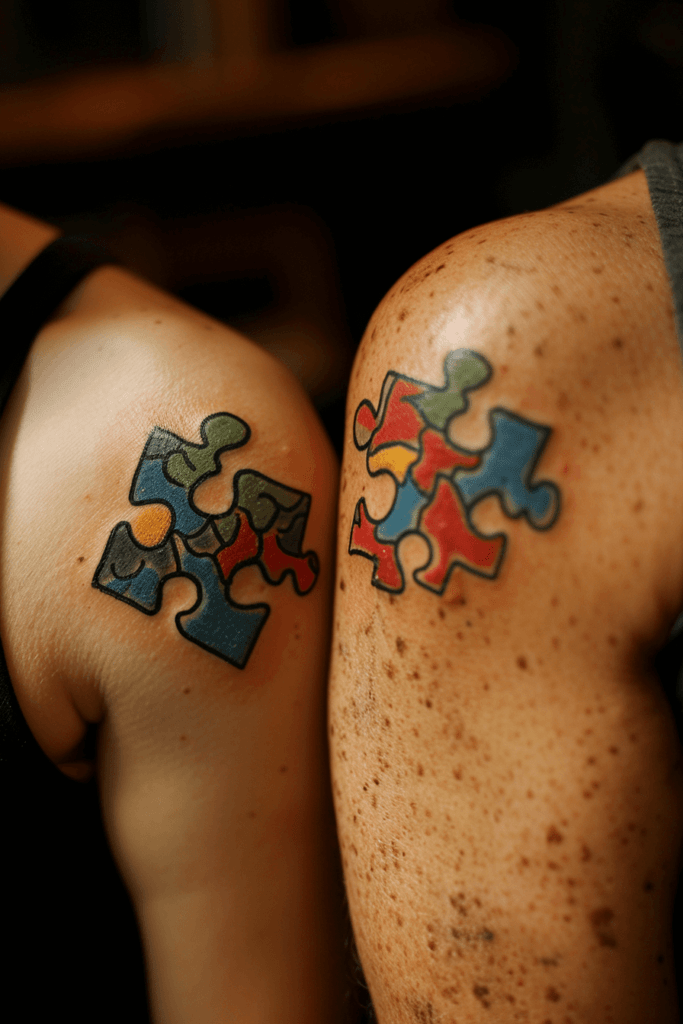 These tattoos feature vibrant puzzle pieces on the siblings shoulders. Each piece fits together, representing how they complete each other. The bright colors make the design stand out. I like this idea because it s playful and highlights the unique connection between siblings.