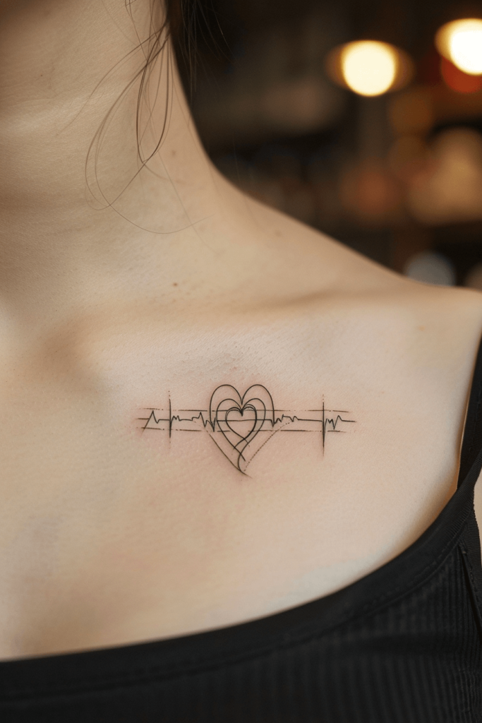 This tattoo on the collarbone shows a heartbeat line that morphs into a heart. The fine lines and precise details make it elegant. I think this tattoo is nice because it symbolizes life and love, showing how your sibling is always in your heart.
