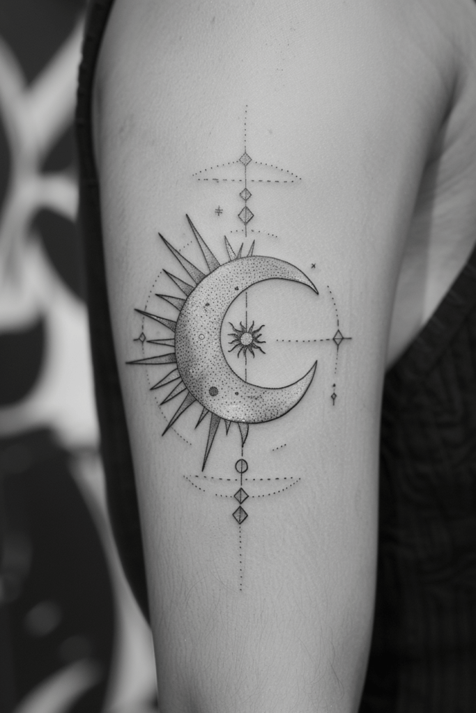This tattoo showcases a detailed sun and moon design on the arm. The intricate lines and dots create a beautiful contrast between the two celestial bodies. This tattoo is impressive because it symbolizes balance and the complementary nature of siblings.