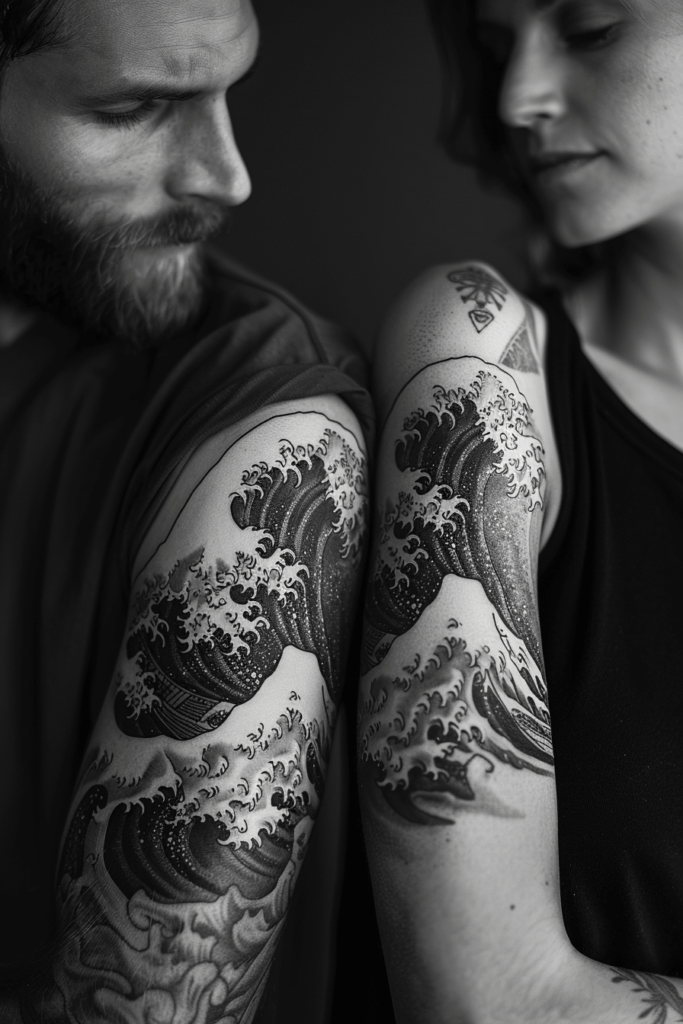 These matching tattoos on the arms depict detailed ocean waves. The black and white design with fine dot work creates a dynamic, flowing effect. This tattoo is impressive because it symbolizes strength and resilience, qualities often found in sibling relationships.
