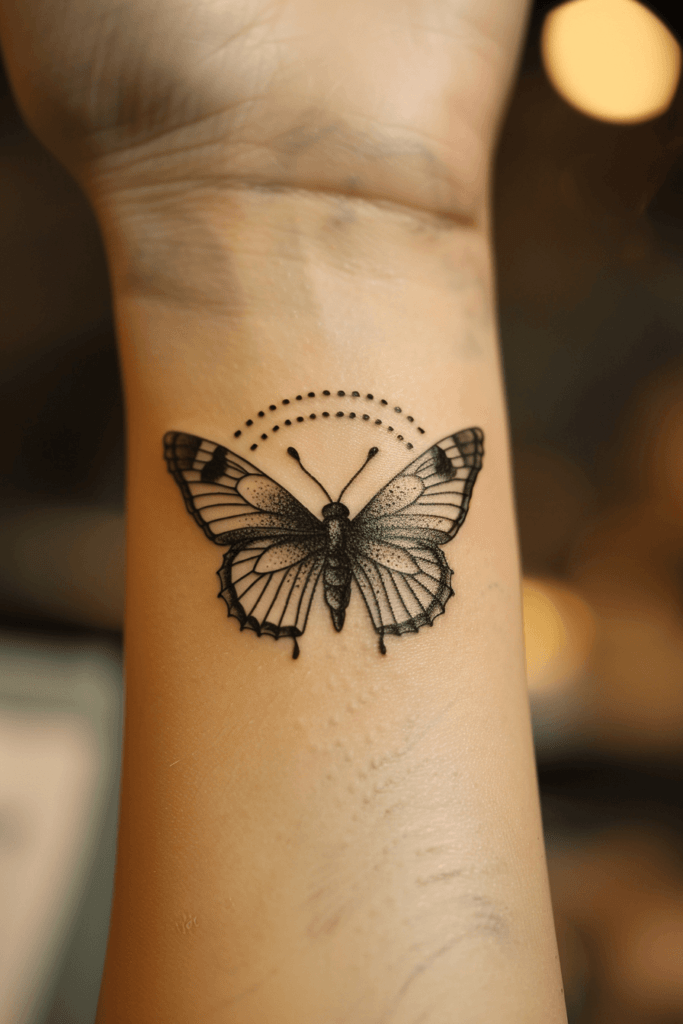 I think this tattoo is beautiful because of its simplicity and charm. The wrist placement makes it easily visible, adding a touch of elegance to everyday movements. It s a small but significant piece that can symbolize transformation and freedom.