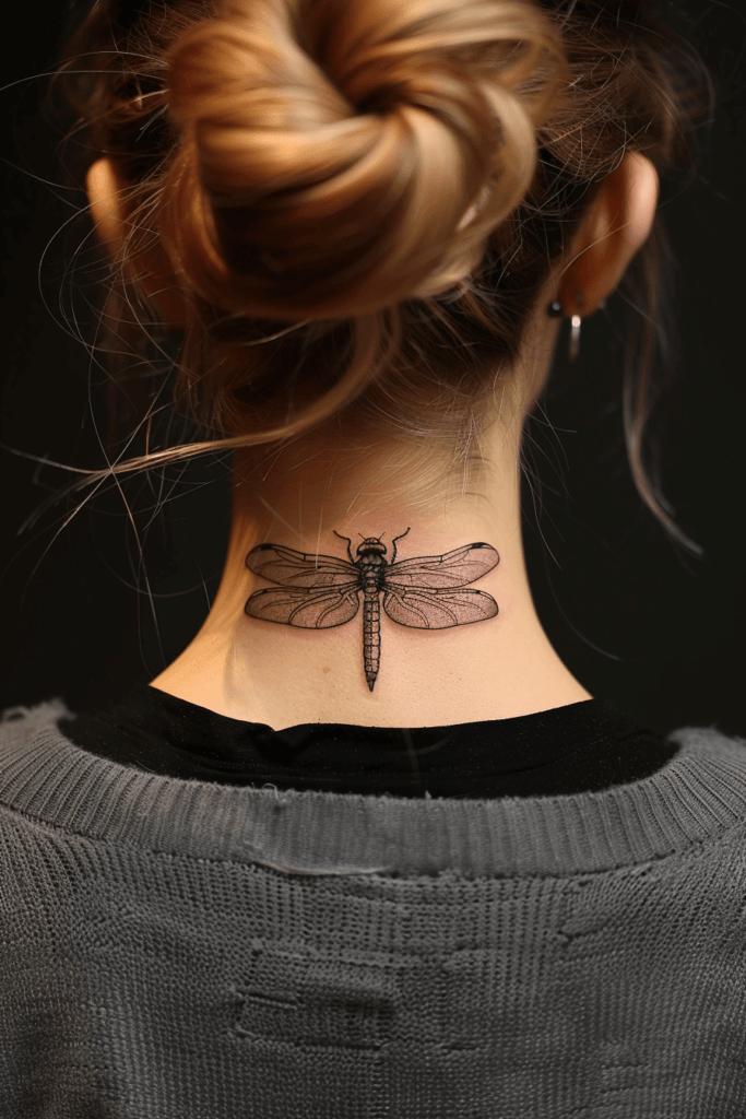 This delicate dragonfly tattoo on the back of the neck features fine line work and intricate details in a realistic style. The placement at the nape of the neck adds an element of surprise and subtlety.