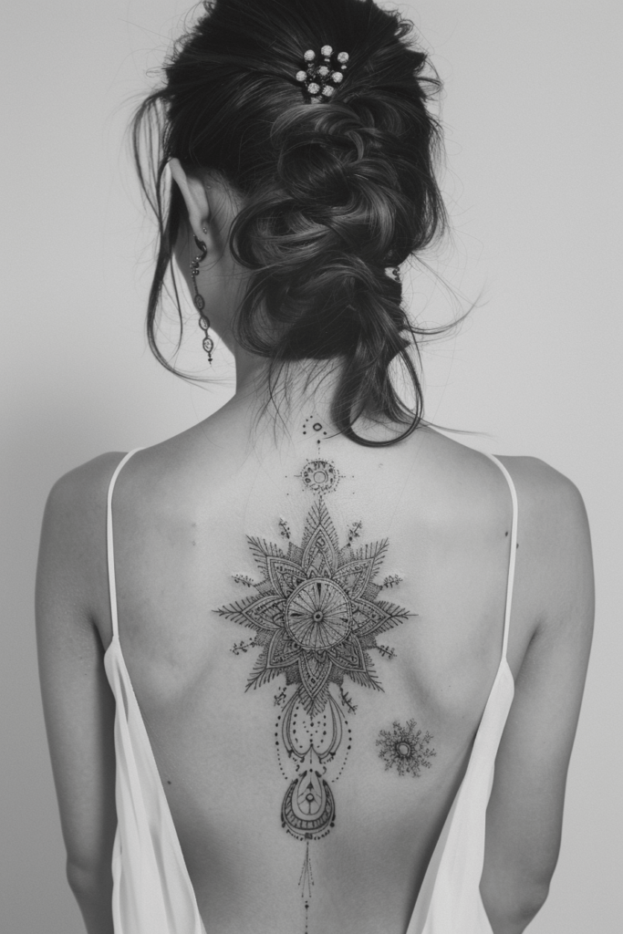 This intricate mandala tattoo runs along the spine, starting from the upper back and extending down, created in a geometric style. The detailed patterns and symmetrical design create a stunning visual effect. The black and grey ink adds depth and dimension to the tattoo.
