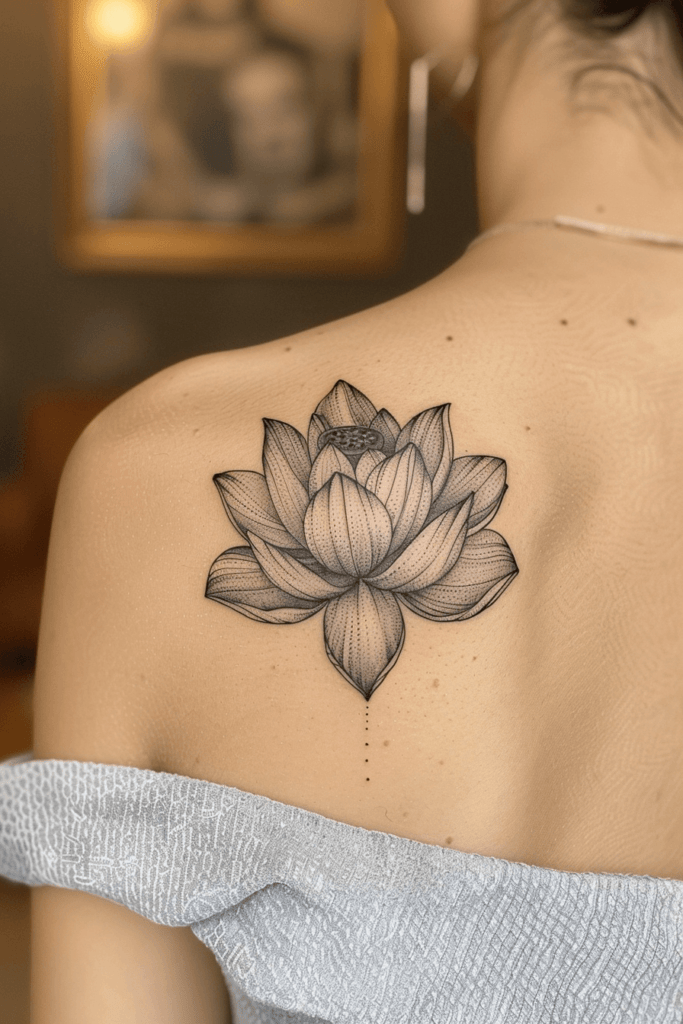 This elegant lotus tattoo on the shoulder features fine lines and dot work. The symmetrical design and shading give it a three-dimensional effect. The lotus flower symbolizes purity and growth, adding depth to the design.