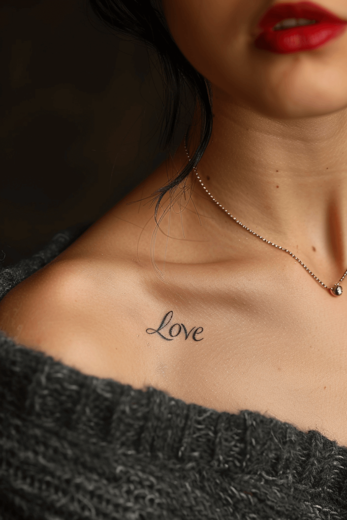 This simple yet elegant script tattoo on the collarbone spells the word Love in a delicate cursive font. The minimalist design and subtle placement make it a sweet and intimate piece.