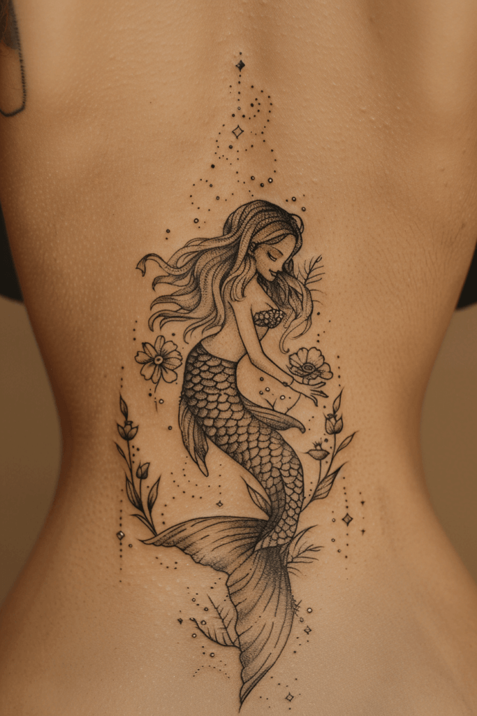 This beautiful mermaid tattoo runs down the spine, featuring a mermaid surrounded by flowers and bubbles in a line art style. The detailed line work and dot shading give it a delicate and ethereal look. The mermaid s graceful pose and flowing hair add to its charm.