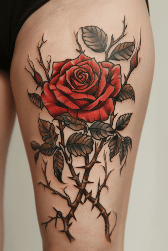 This bold rose tattoo on the thigh showcases a vivid red rose with detailed black leaves and thorns in a neo-traditional style. The contrast between the bright red and dark black ink makes the design pop. The placement on the thigh adds a touch of allure and sophistication.