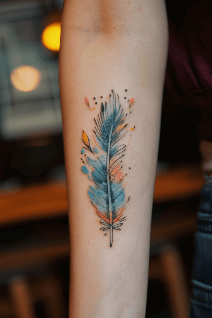 This colorful feather tattoo on the forearm uses a watercolor style with shades of blue, orange, and yellow. The design appears as if painted onto the skin, with soft lines and splashes of color.