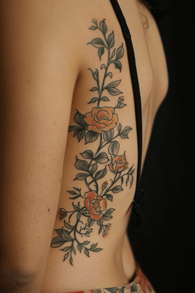 This vertical rose vine tattoo stretches along the side of the body, from the ribs to the hip. The design showcases orange roses in full bloom with intricate green leaves. The detailed linework and vibrant colors make this tattoo stand out, creating a stunning visual effect.