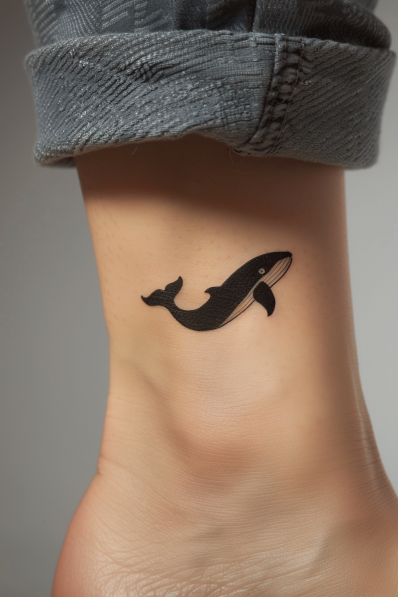 This whale tattoo is a bold and graceful design, featuring the sleek silhouette of a whale. The simple black ink gives it a clean and minimalist look, while the whale itself represents strength, depth, and peacefulness. The placement near the ankle adds a fun touch, as if the whale is gently swimming along with each step you take. It s a powerful yet subtle tattoo that carries a sense of calm and wonder for the ocean.