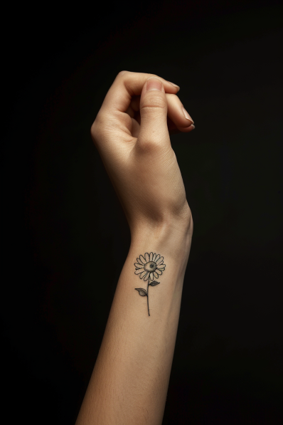 This daisy flower tattoo is as simple as it is sweet. The delicate black lines capture the gentle beauty of a daisy, with its petals perfectly spread out and a small leaf on the stem. It s a light and cheerful design, often associated with innocence, purity, and new beginnings. Placed on the wrist, this tattoo is both subtle and meaningful, giving off a fresh and positive vibe.