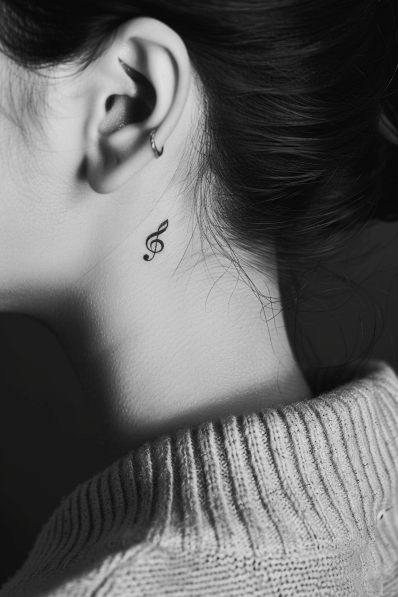 This treble clef tattoo is a small but impactful tribute to the love of music. Placed just behind the ear, it s a quiet nod to the tunes that shape our lives. The design is simple a clean, black treble clef yet it speaks volumes to anyone with a deep connection to sound, melody, and rhythm. It s elegant and subtle, perfectly suited for someone who wants to wear their passion for music without being too loud about it (pun intended!).