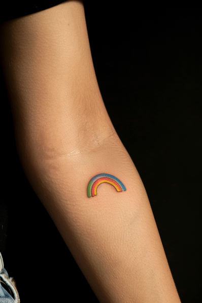 This rainbow tattoo is small but bursting with color, showcasing the classic arch of vibrant shades. The bold use of red, orange, yellow, green, blue, and purple creates a fun and positive design, making it a cheerful little piece of art. Rainbows often symbolize hope, positivity, and diversity, and this tattoo captures all of that in a compact, colorful package.