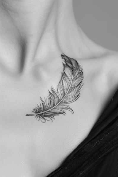 This feather tattoo is a delicate and beautifully detailed design that almost looks like it could float off the skin. Each strand is carefully shaded, giving the feather a soft, airy appearance. The placement on the collarbone accentuates its natural flow, making it seem like it s gently resting or being lifted by a breeze. Feathers are often symbols of freedom, lightness, and letting go, and this design embodies that perfectly with its graceful form.