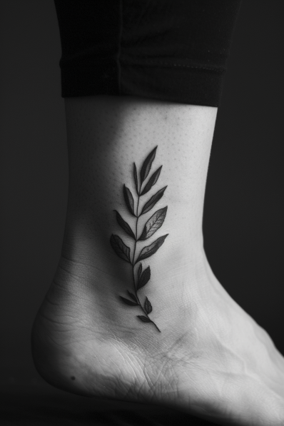 This leaf branch tattoo exudes a natural, delicate elegance. The design follows the natural curve of the ankle, with each leaf finely detailed to give it a soft, organic feel. The black ink contrasts beautifully against the skin, making the leaves appear almost lifelike. It s the perfect tattoo for someone who finds peace and beauty in nature, as the flowing design reflects growth and connection to the earth.