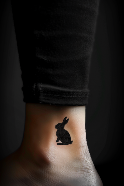 This silhouette rabbit tattoo is both charming and minimalist, featuring a solid black outline of a sitting rabbit. The bold design is simple yet striking, capturing the innocence and curiosity that rabbits are known for. Its placement near the ankle gives it a playful touch, as if the rabbit is quietly hopping along with you wherever you go. The lack of fine detail makes this tattoo even more impactful, allowing the strong shape to take center stage.