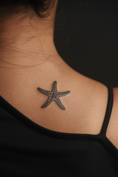 This starfish tattoo is a beautifully detailed tribute to the ocean. The design captures the texture and shape of a real starfish, with subtle shading that gives it a lifelike, three-dimensional look. Its placement on the shoulder adds to its charm, almost as if the starfish has washed ashore and found a home on your skin. It s a simple yet striking piece, perfect for anyone with a love for the sea.